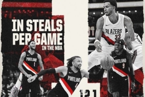 体育资讯11月5日讯 开拓者官方发布数据海报,球队场均送出12.1次抢断,排名联盟第一。